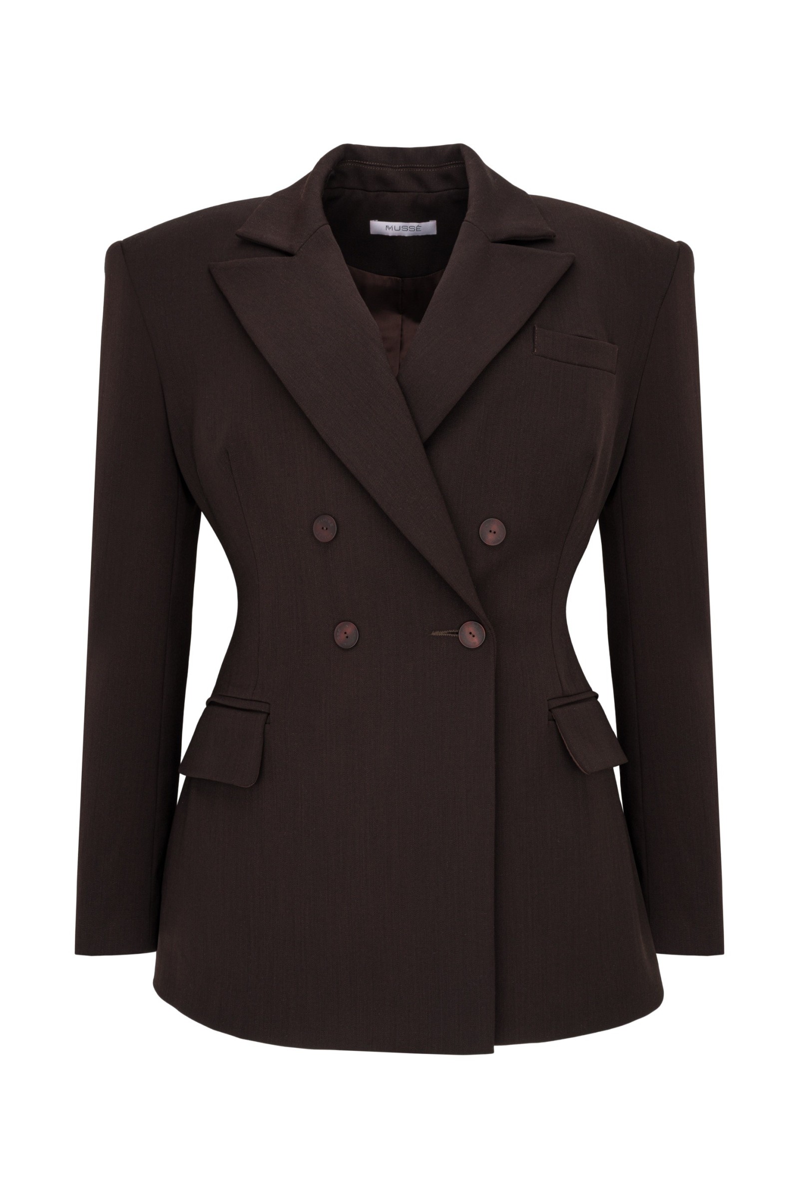 Marynarka SUPREME CHOCOLATE to wyrazista, perfekcyjnie skrojona forma, która rzeźbi sylwetkę od pierwszego założenia. Jej charakter określają mocno zarysowane, monumentalne ramiona, które budują odważną, nowoczesną linię i przyciągają uwagę. Głębokie taliowanie podkreśla figurę, a rozszerzany dół dodaje proporcji i tworzy efekt idealnej "klepsydry".
