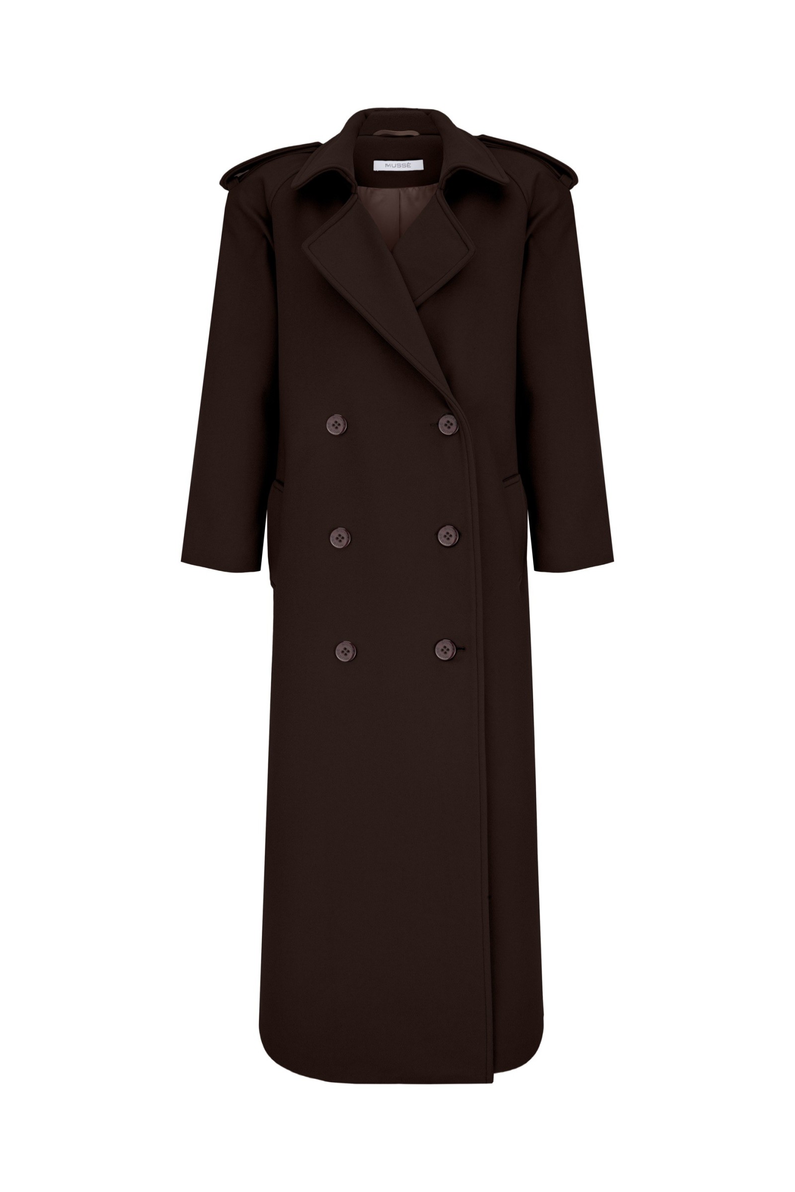 Długi dwurzędowy płaszcz z dziewiczej wełny w najmodniejszym kolorze sezonu- ciemnej czekoladzie.