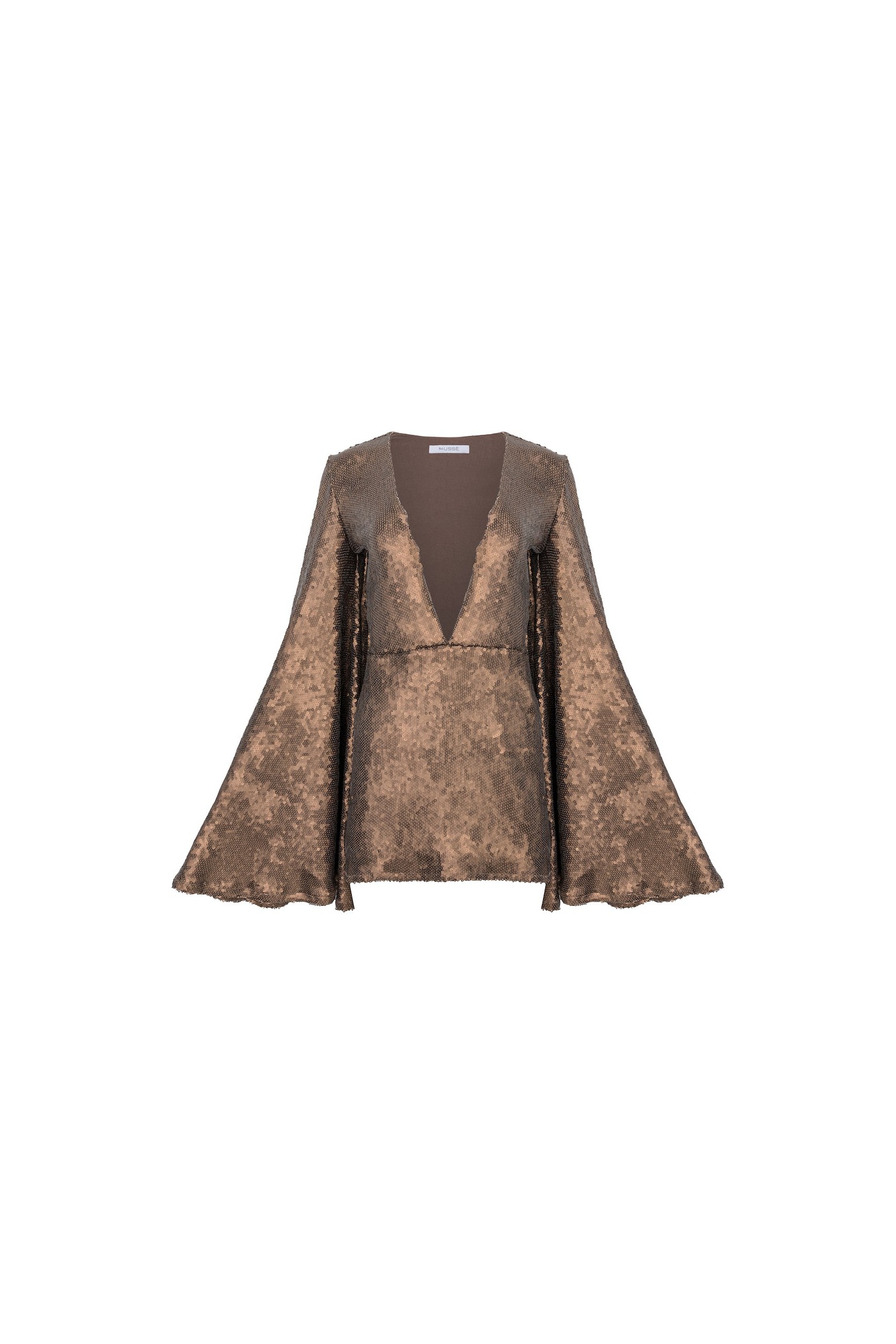 Sukienka mini z przepięknym, głębokim dekoltem w kształt litery V i niezwykle szerokim oraz niestandardowo długim rękawem, zakrywającym dłoń. Sukienka wykonana jest z elastycznej wiskozy pokrytej wysokogatunkowymi cekinami o matowym wykończeniu, dzięki czemu sukienka jest rozciągliwa, a co za tym idzie- wyjątkowo wygodna. Sukienka posiada zamek ukryty w szwie, który ułatwia jej nakładanie i zdejmowanie. Noś ją na dwa sposoby! Wyciętą częścią z przodu, eksponując dekolt, lub wyciętą częścią z tyłu, eksponując plecy. W zestawie dołączamy specjalne plastry do ubrań, aby każda z Was czuła się komfortowo.